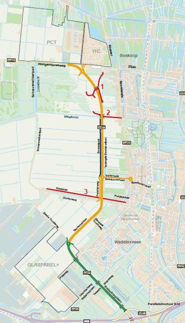 De N207 Zuid is tevens onderdeel van het plan voor de uitbreiding van Greenport Boskoop (LINK). Dat is het enorme gebied linksboven op de kaart met de naam Pot Container Centrum (PCT) voor o.a. nog meer klimaatopwarmende kassen en bmc’s. Ook Waddinxveen heeft hiermee ingestemd.